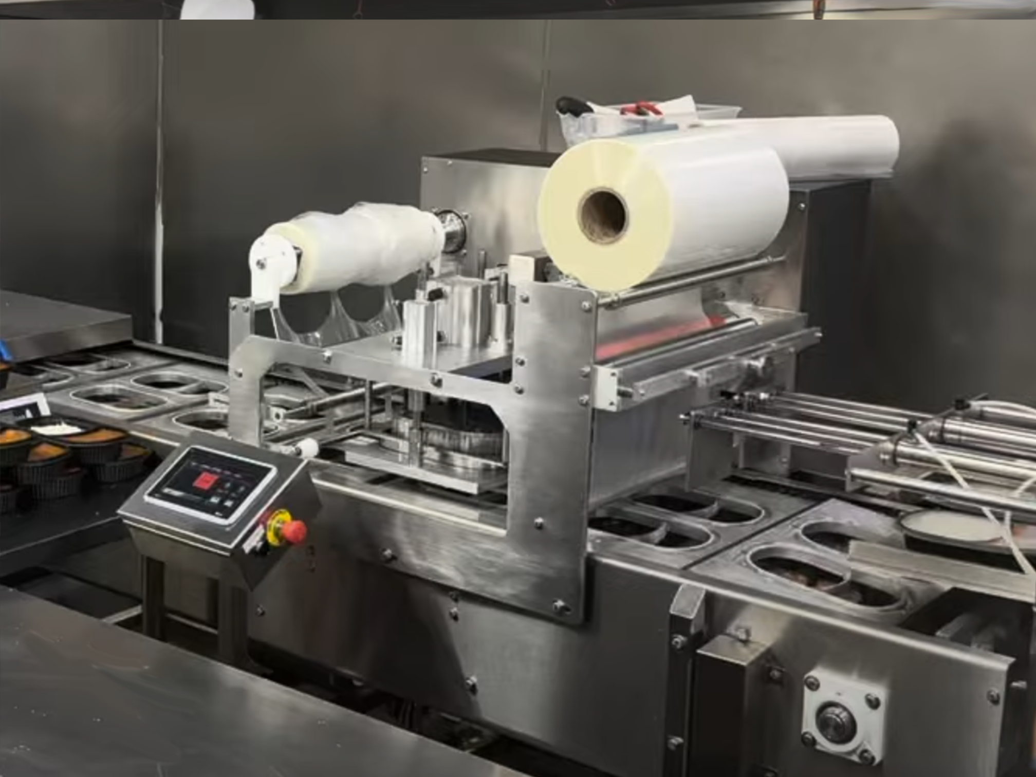 A roll stock sealer with die cut. Plain, random print, or preprinted film for rectangular trays and bowls.