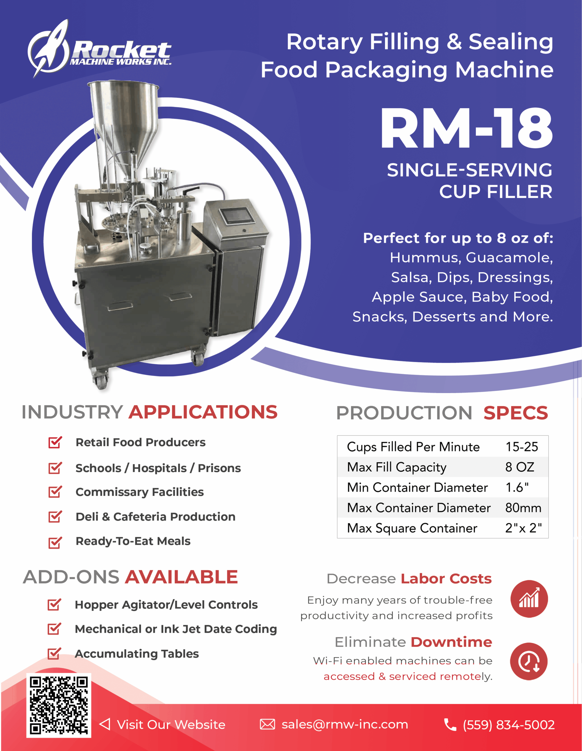 For operations in food, dairy, deli, and specialized packaging, operational success hinges on speed, consistency, and strict regulatory compliance. These factors are non-negotiable foundations for production efficiency and customer satisfaction. That is why industry leaders rely on the RM-18 Rotary Filler and Sealer from Rocket Machine Works. Engineered for utility, the RM-18 is designed to perform one function with exceptional reliability: execute precise cup filling and sealing at volumes dictated by demanding production schedules.