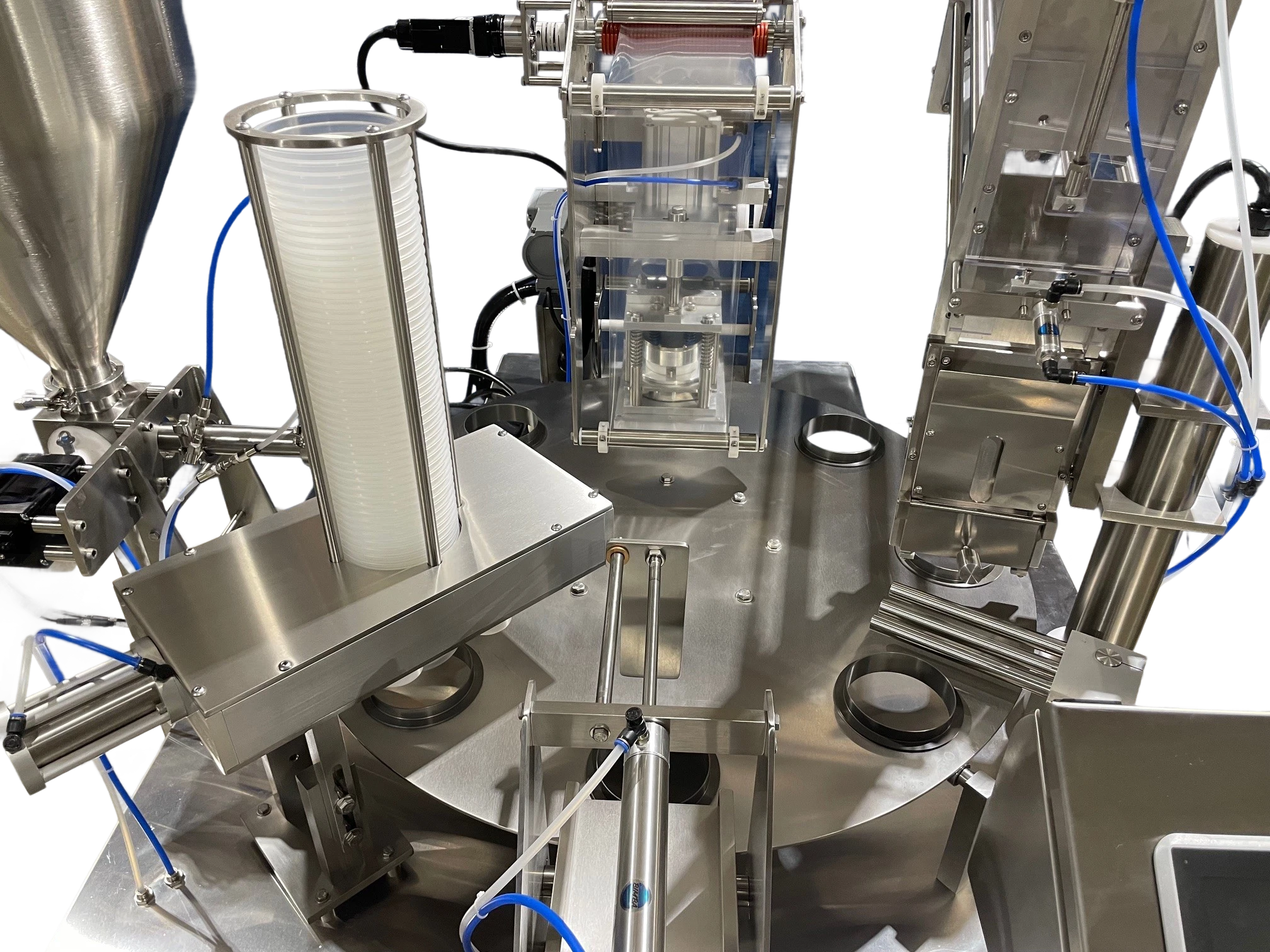 An eight-position rotary cup filler for die-cut foils or roll stock film with die cut.