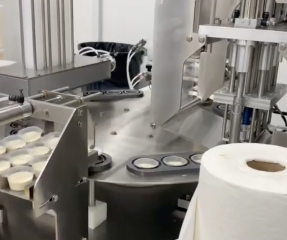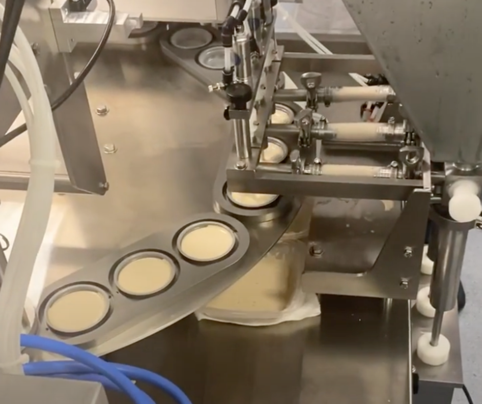 An eight-position rotary cup filler for die-cut foils or roll stock film with die cut.